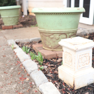 I’ve had these green pots for several years and have decided to do something different with them this year. I set them on either side of our sidewalk, creating a symmetrical effect. Underneath the pots, I laid out some bricks in a pattern to give the pot some height and encourage draining. The plan is to paint them a soft green, gray color. I’d like to create a topiary using tomato cages and ivy. We shall see what happens!
